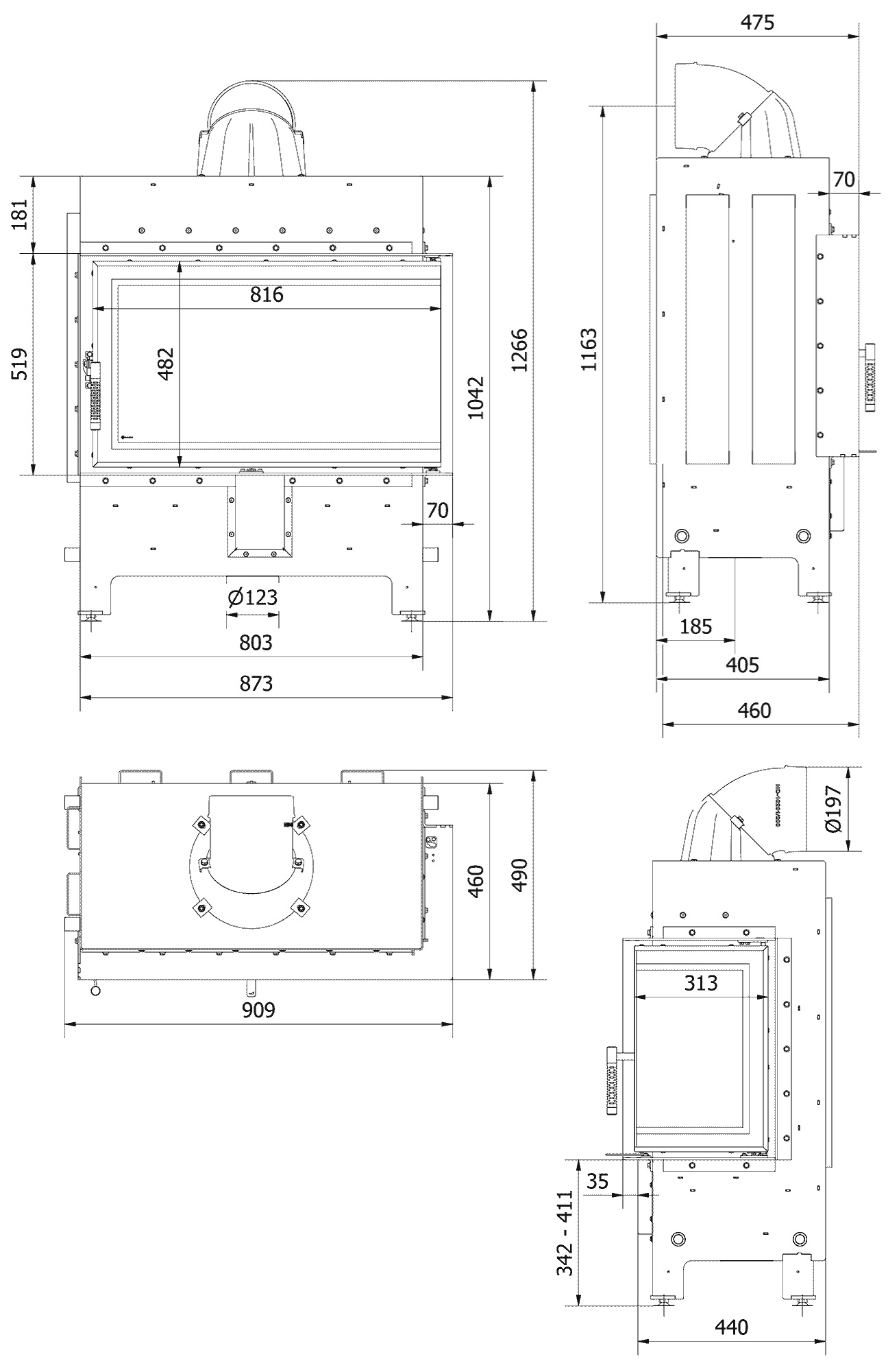 Spaľovacia komora je obložená materiálom Termotec, ktorý zabezpečuje efektívne spaľovanie, akumuluje teplo a zvyšuje teplotu v peci. Nový dizajn - drážkovaný povrch dodáva krbu eleganciu a moderný charakter.