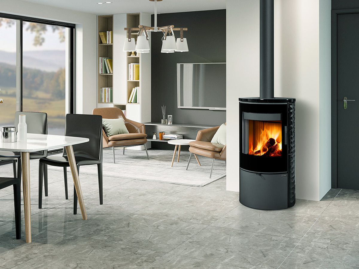 Zaoblený tvar krbových kachlí SONE G spoločne s dizajnovým sklom poskytujú príjemný pohľad na oheň, ktorý nikdy nezevšední.